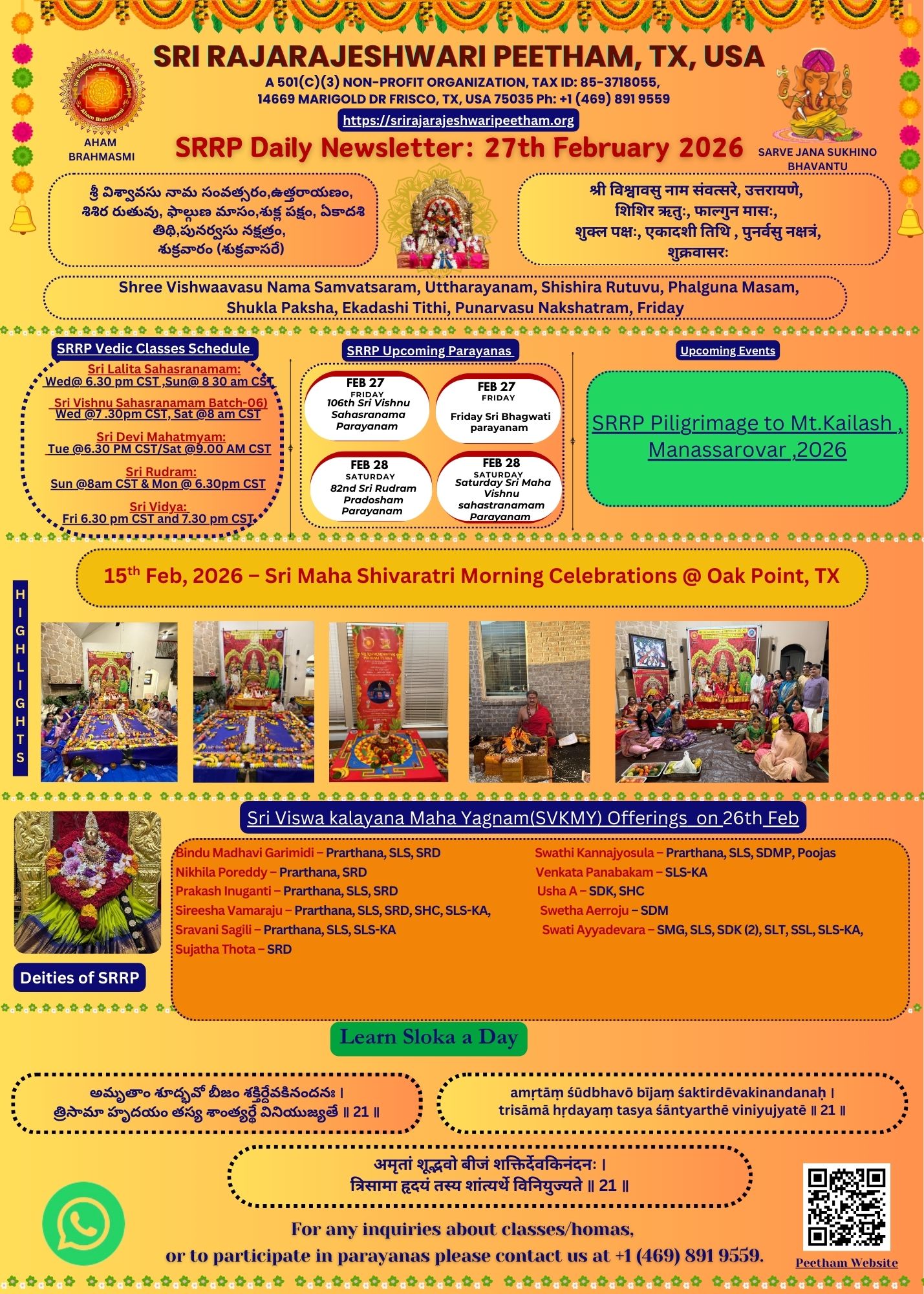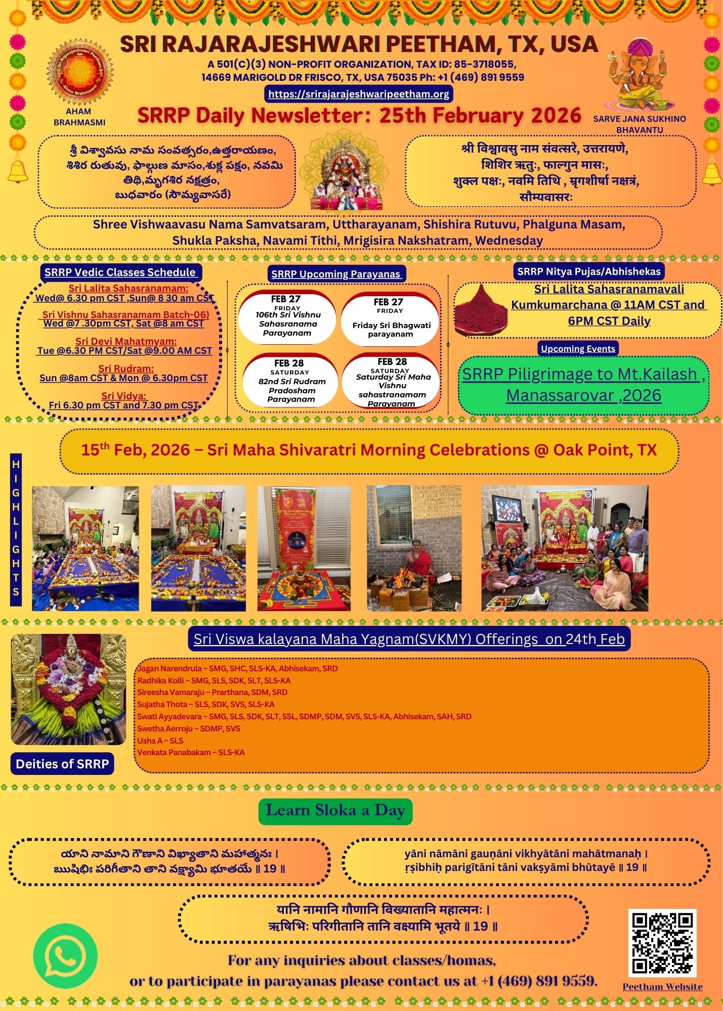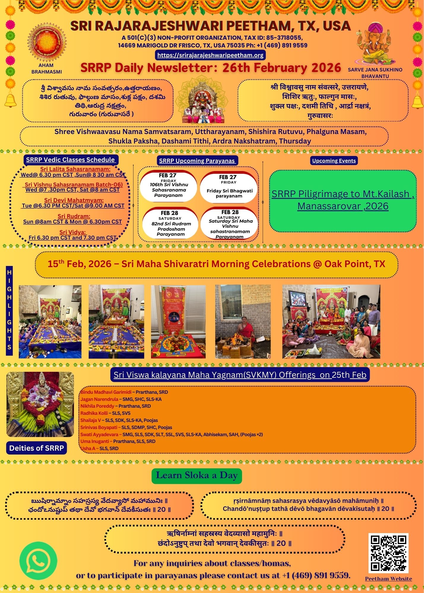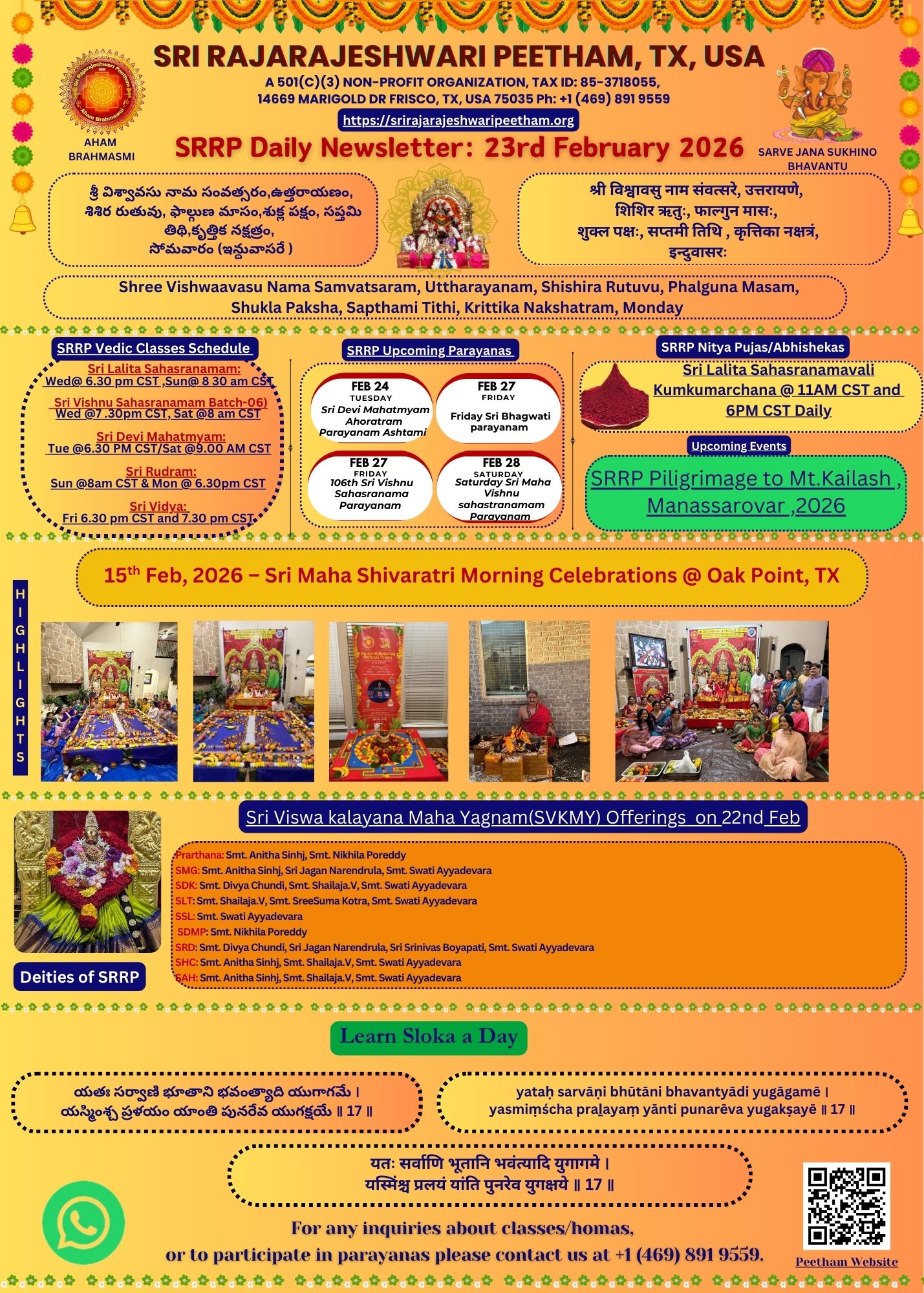 Sri Rajarajeshwari Peetham is a Hindu spiritual non-profit organization founded by spiritual aspirants with a goal to spread Sanatana Dharma through continuous spiritual education, sadhana/practice, and services with a main focus on future generations across the globe. Our Gurukulams are an inclusive concept without language, gender, and caste barriers and provide FREE education to everyone who is interested in learning sacred scriptures. Till-date, SRR Peetham has offered a spiritual education to almost 500 students from all over the world including the USA, Canada, the Indian sub-continent, etc, and continues our spiritual journey as a global family.
