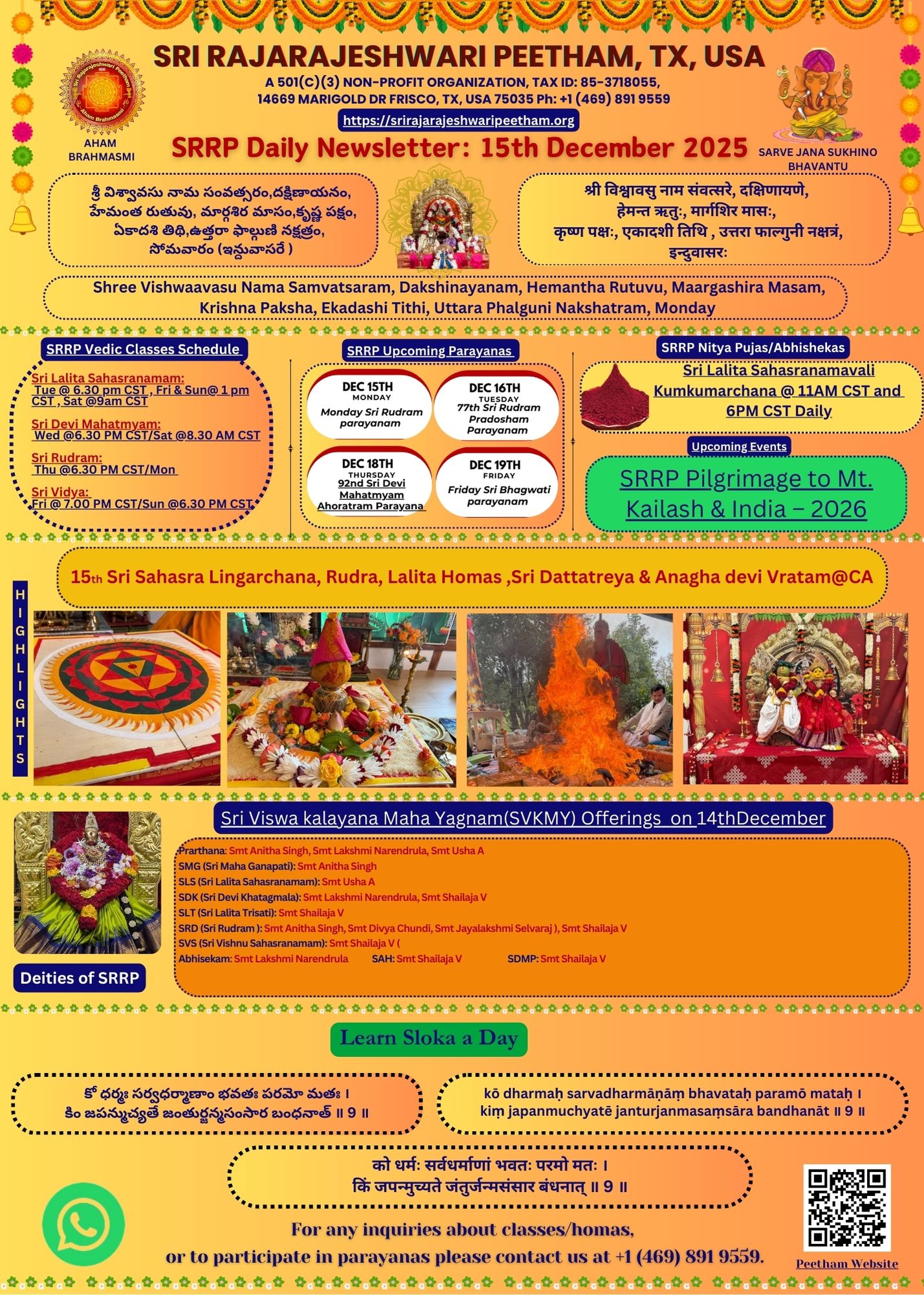 Sri Rajarajeshwari Peetham is a Hindu spiritual non-profit organization founded by spiritual aspirants with a goal to spread Sanatana Dharma through continuous spiritual education, sadhana/practice, and services with a main focus on future generations across the globe. Our Gurukulams are an inclusive concept without language, gender, and caste barriers and provide FREE education to everyone who is interested in learning sacred scriptures. Till-date, SRR Peetham has offered a spiritual education to almost 500 students from all over the world including the USA, Canada, the Indian sub-continent, etc, and continues our spiritual journey as a global family.